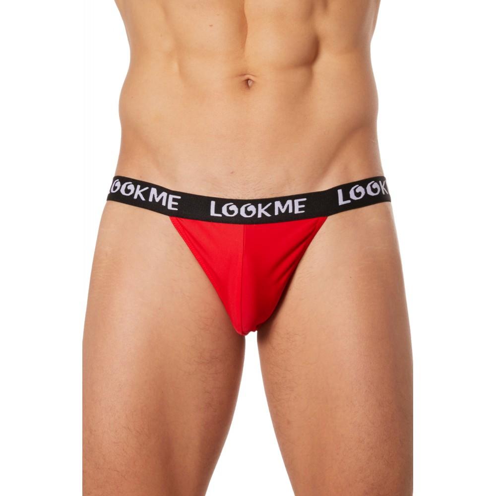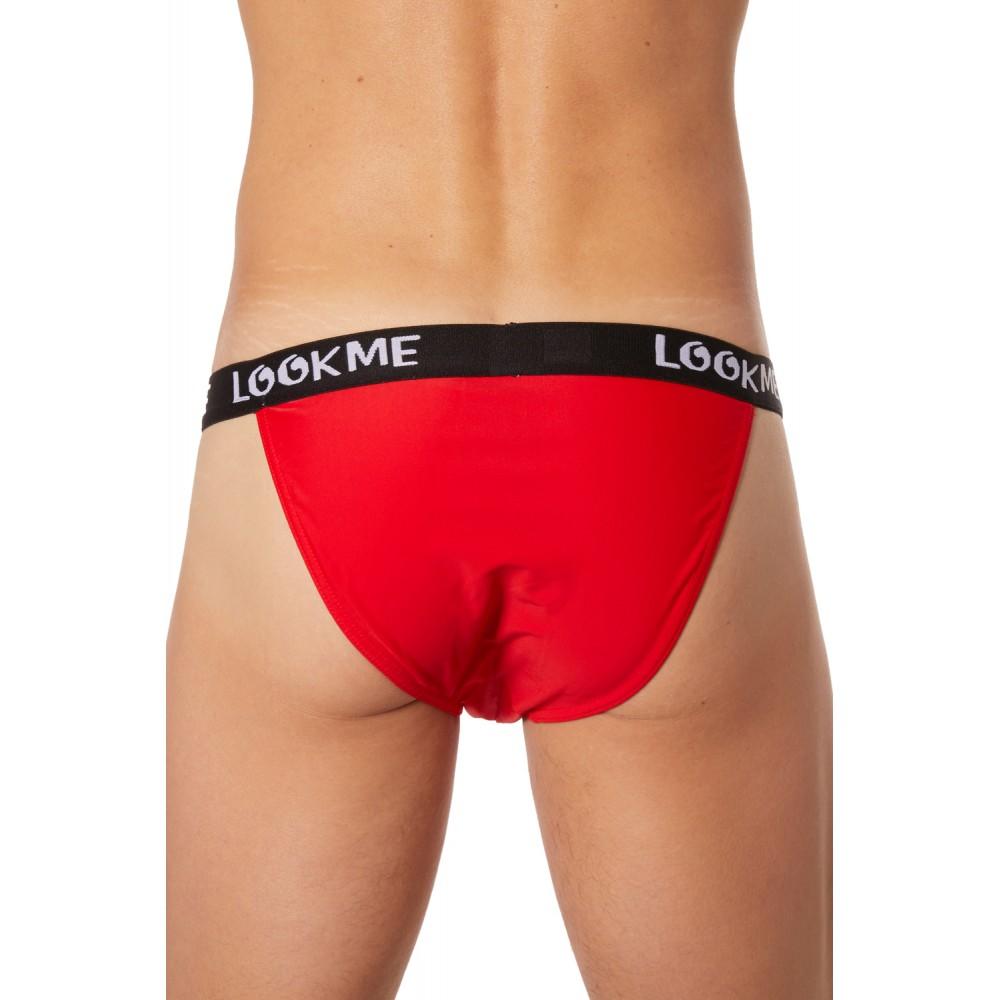 Splendido paio di slip da uomo rossi con fascia in vita dentellata per un fascino assoluto. Un ampio elastico nero con la scritta “Look Me”.