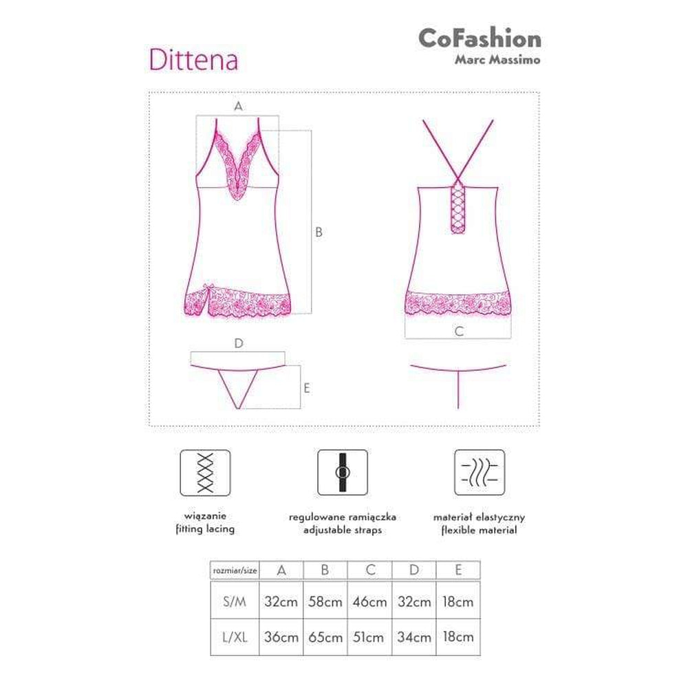 Dittena è una superba camicia da notte da donna in pizzo nero con un taglio sensuale e un piccolo spacco sulla coscia, decorato con un piccolo fiocco rosso.