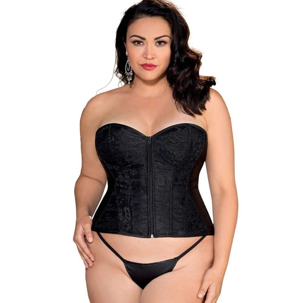 Elegante sia nella lingerie che negli abiti da sera, questo corsetto in raso nero senza spalline per donne formose è ricoperto sul davanti da un grazioso pizzo.