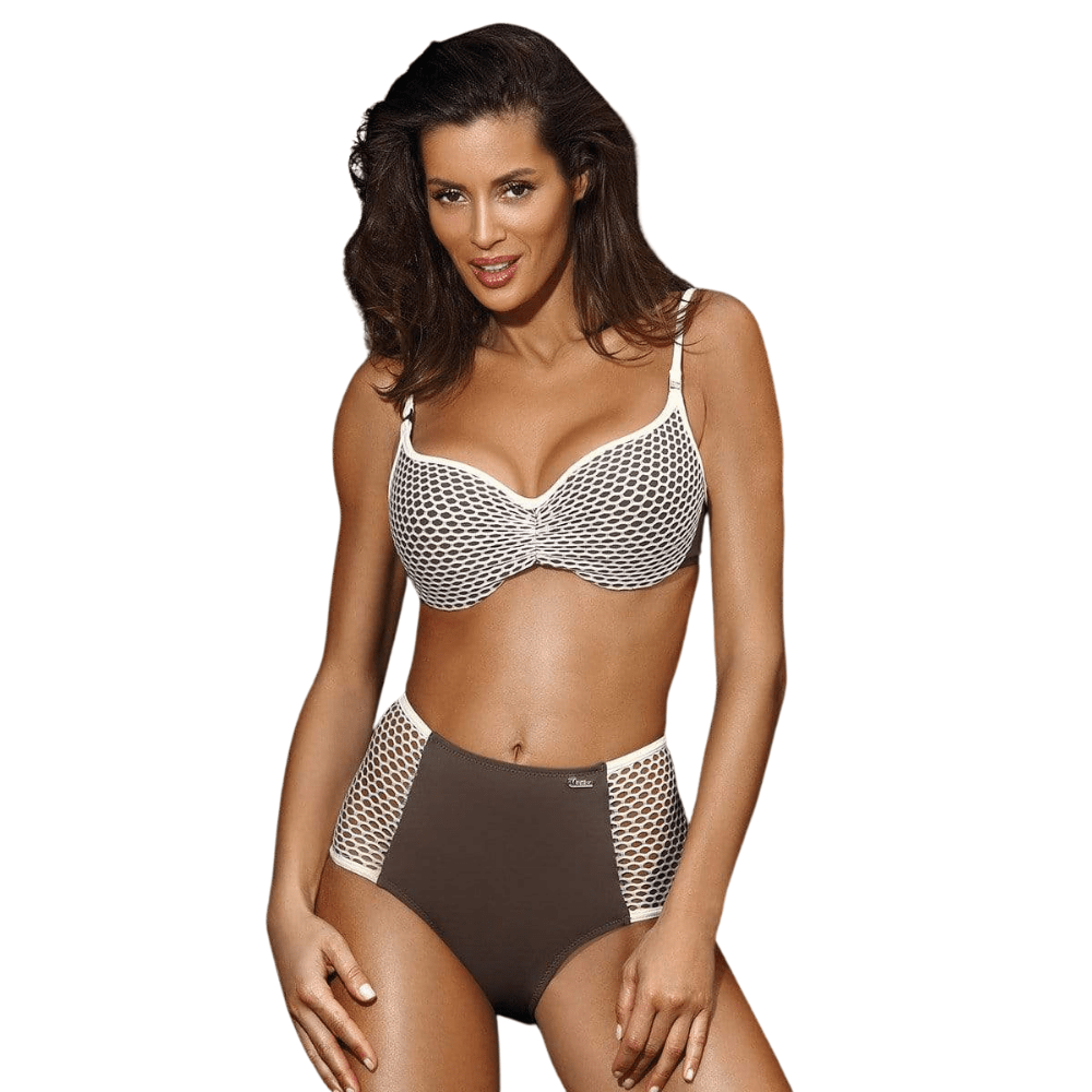 Il costume da bagno Martha Dark Taupe 2-Piece White è un pezzo unico che vi farà apparire eleganti e femminili in spiaggia. Lo slip rialzato allunga otticamente le gambe e nasconde le piccole imperfezioni. Il set è realizzato in uno stile retrò alla moda e presenta una decorazione traforata che copre le coppe del reggiseno. Le spalline sono regolabili e la circonferenza si chiude con una fibbia. Gli intriganti slip offrono un comfort ottimale e sono realizzati in tessuto italiano di alta qualità di Carvico nei colori moka e crema perfettamente coordinati. Il costume da bagno a 2 pezzi Martha Dark Taupe white è realizzato in 80% poliammide e 20% elastan.