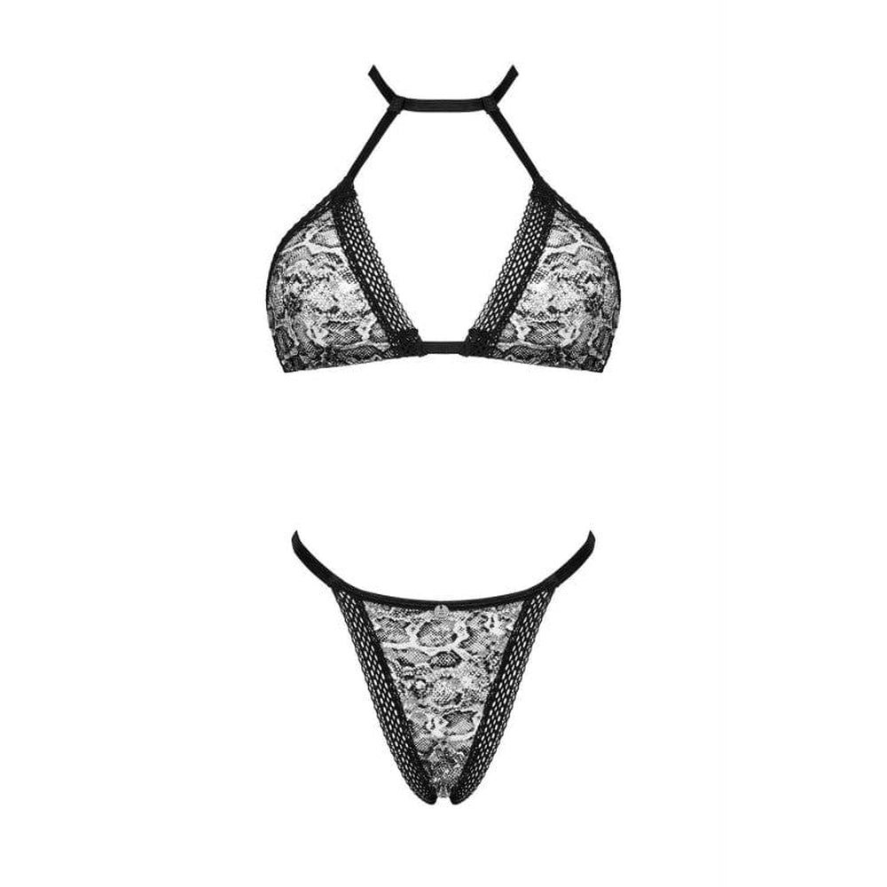 Questo set è composto da un reggiseno e da un perizoma coordinati, ornati da motivi animali e pizzo per un tocco di eleganza. Il reggiseno a triangolo è regolabile per un comfort ottimale, mentre il perizoma coordinato abbraccia perfettamente i fianchi per mettere in mostra il sedere e le gambe. Il tessuto morbido e delicato (90% poliammide, 10% elastan) garantisce un comfort ottimale. Aggiungete quindi questo set Xenita alla vostra collezione di lingerie maliziosa per notti torride e piene di sex appeal!