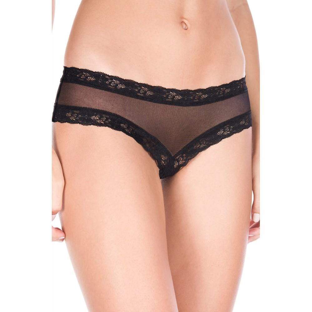 Un morbidissimo tanga nero in rete trasparente e rifiniture in pizzo.