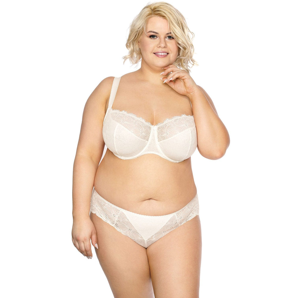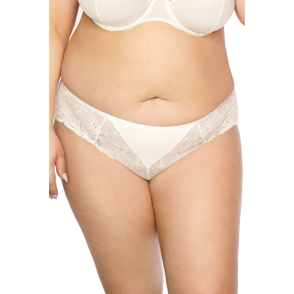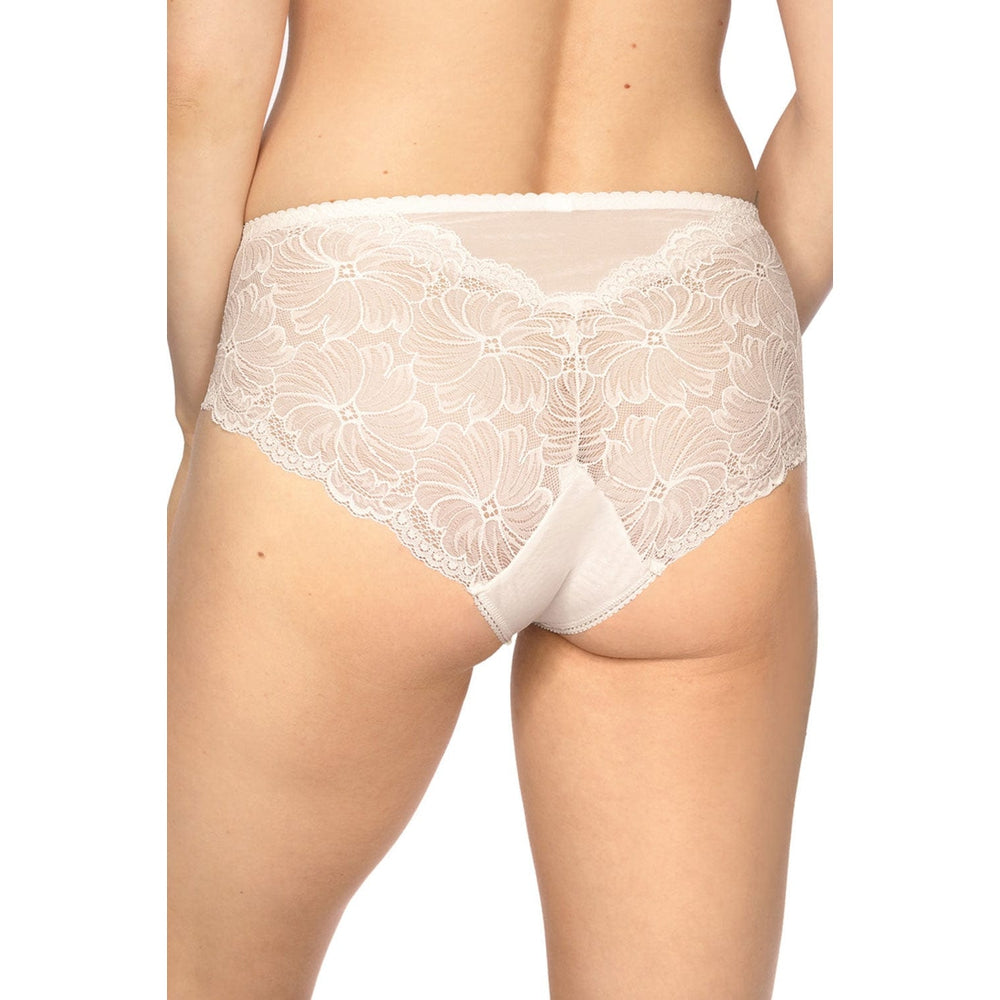 Colletto in una combinazione di pizzo traforato e tulle a rete con una maglia morbida. La mutandina ha un taglio rialzato e non ha cuciture laterali, quindi si adatta perfettamente.