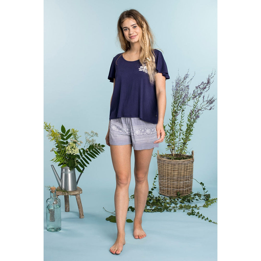 Pigiama da donna in viscosa di alta qualità. T-shirt a maniche corte con una delicata stampa sul petto. Comodi pantaloncini corti decorati con un motivo folkloristico.