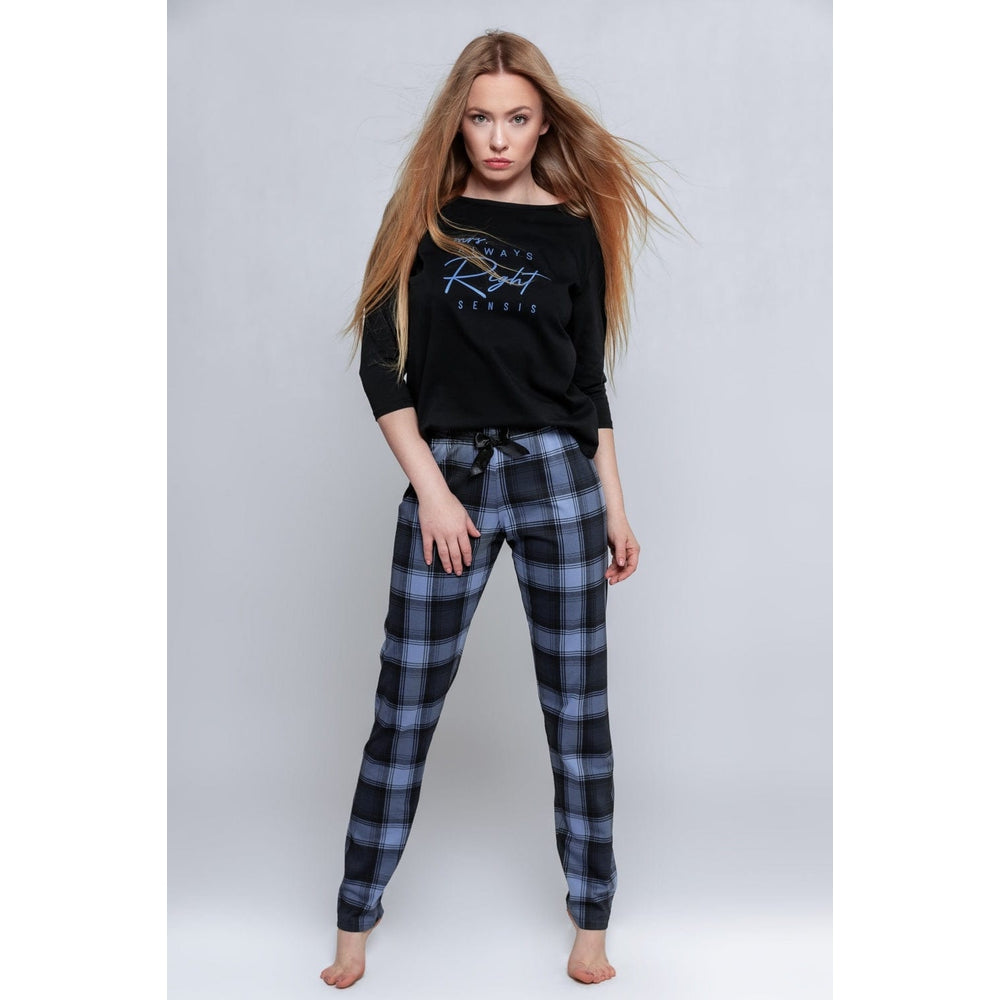 Sensuale pigiama invernale a due pezzi da donna con la scritta My always Right, di Sensis. Cotone nero e blu. Camicetta con sottile scollatura a mandorla e maniche al gomito.
