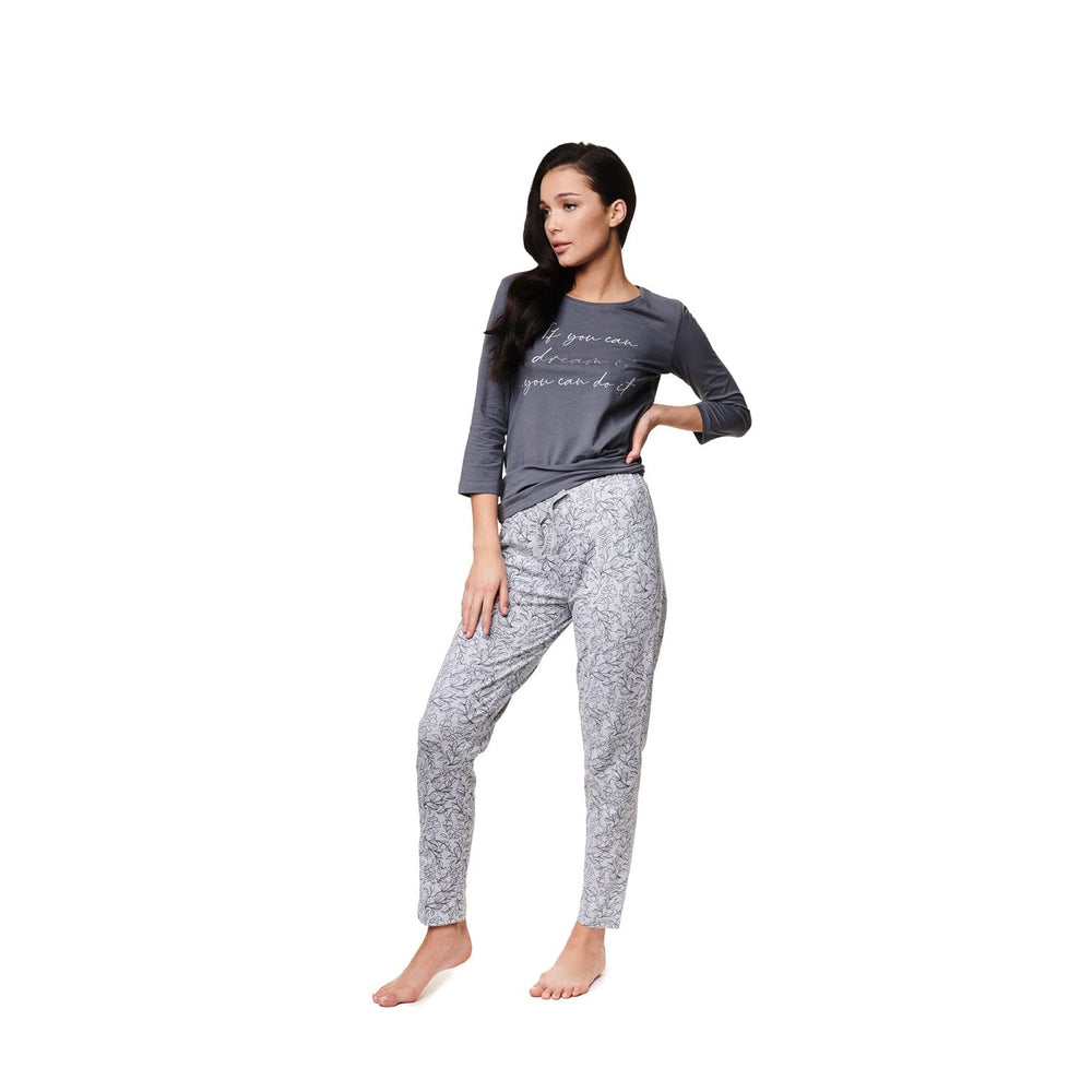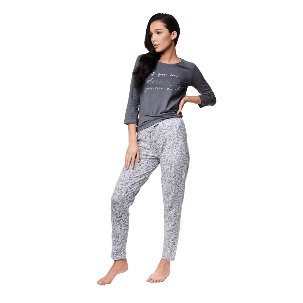 Elegante e originale pigiama invernale a due pezzi da donna, nei tenui colori del grigio. Camicetta con stampa al centro, dal taglio classico e confortevole.
