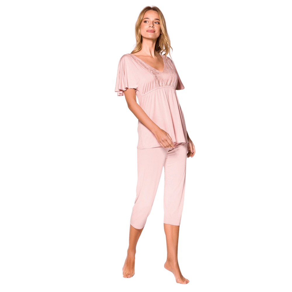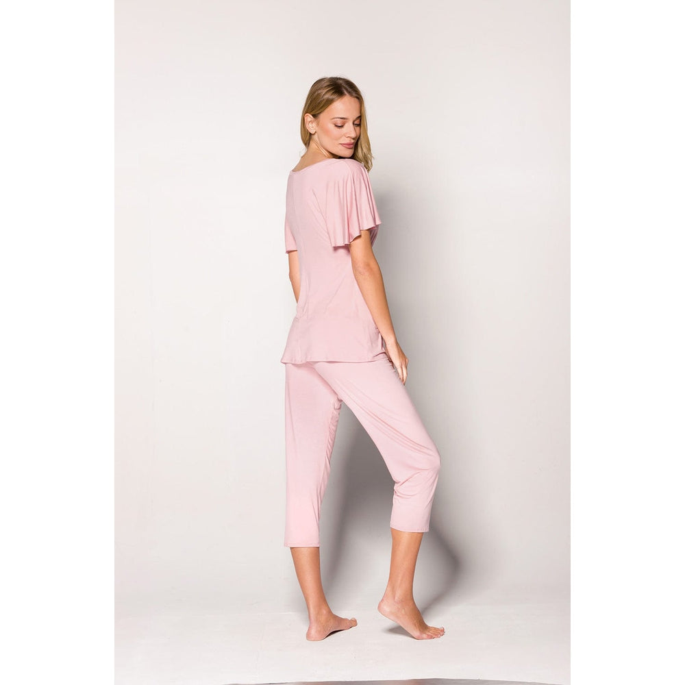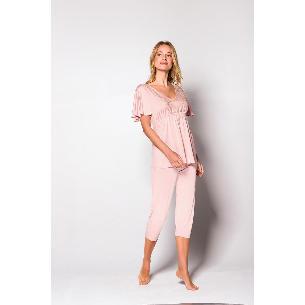 Morbido pigiama da donna con leggera scollatura rifinita da un piacevole pizzo di viscosa. Le maniche a fantasia con una leggera arricciatura aggiungono leggerezza e fascino al pigiama.