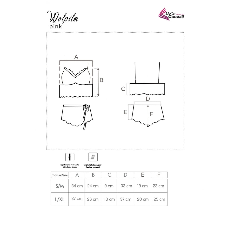 Il corpetto profondamente sceso con coppe morbide ha un bordo di pizzo sulla scollatura e un’ampia balza a fantasia che corre sotto il seno. Le mutandine sono concepite come pantaloncini con una sottile fascia di raso lucido in vita.